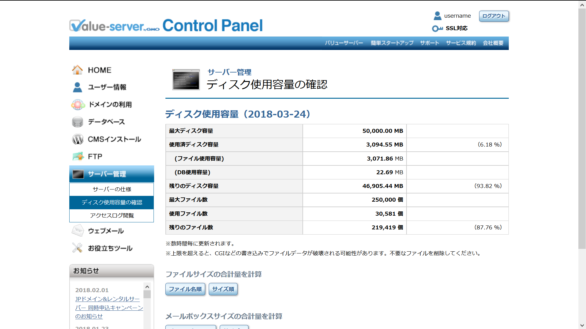 ディスク使用容量の確認